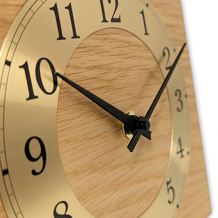 Natuhr Tischuhr Eiche geölt Holz - Knick - Massivholz Design - goldener Metall Zahlenreif